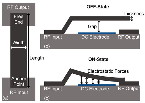 - Shalaby, M.M.; Wang, Z.; Chow, L.L.-W.; Jensen, B.D.; Volakis, J.L.; Kurabayashi, K.; Saitou, K. Robust Design of RF-MEMS Cantilever Switches Using Contact Physics Modeling. IEEE Trans. Ind. Electron. 2009, 56, 1012–1021. [Google Scholar] [CrossRef]