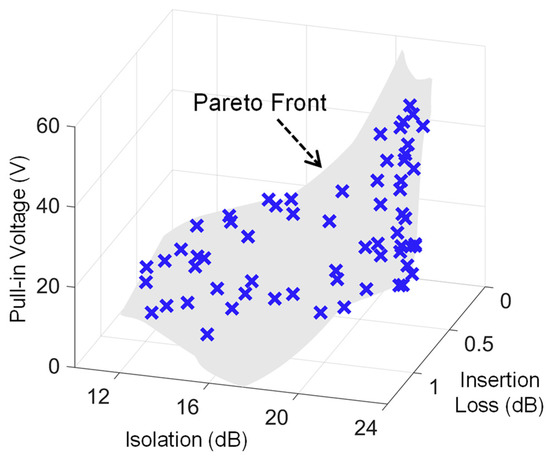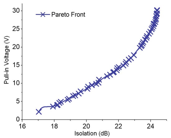 Notably, in order to ensure a mechanically robust design, the maximum stress at the switch anchors was constrained below the yield strength of the switch material (gold). Meanwhile, the beam stiffness was restricted to above 10 N/m, as suggested in [35]. The extracted optimal solution set shown in Figure 7 validates the contrasting behavior of pull-in voltage and RF isolation, where, for the chosen design space, the optimal isolation and pull-in values vary from 3 V to 30 V and from 15.5 dB to 24.2 dB, respectively. Furthermore, identification of these variations in an optimal solution set enables designers to explore the design space effectively.