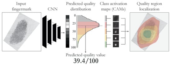The proposed approach. We used a Convolutional Neural Network (CNN) trained on quality annotations provided by 10 dactyloscopic experts to predict a quality probability distribution as a first intermediate step. From this distribution, we derived the final quality value, as well as the uncertainty of the model and, consequently, the complexity of the input image. Furthermore, we used Class Activation Maps (CAMs) to localise image regions, which contributed most to the specific quality ranges in the predicted quality distribution. The figure is best viewed in colour.