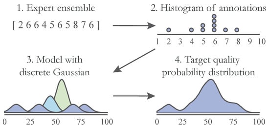 Here, is a parameter for the standard deviation of the normal distribution . We assumed equal for all grading functions and set it to 1. However, if the uncertainty of the individual labels is known (for example, if an examiner is less confident in his/her decisions), we can modify this parameter accordingly. The process of creating the target probability distributions is shown in Figure 2.