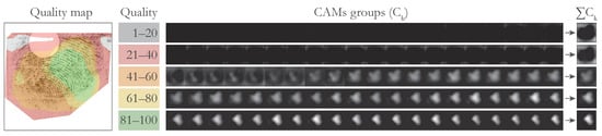 The second interpretation is a quality map. We wanted to calculate how much individual pixels contributed to a specific sub-range of the final quality spectrum. To achieve that, we joined together K groups of consecutive CAMs in C. The parameter K determines the number of quality levels, which will be assigned to individual pixels. The choice of K is arbitrary and can be changed based on the requirements of the final system. In our approach, we used to ensure a direct comparison and to maintain compatibility with some previously established quality metrics (friction ridge quality is commonly divided into 5 quality levels in the related literature [14,20]). We split C into groups , , , , and . For each group , we added together the contained CAMs into a single map . The resulting maps thus show pixel contribution towards a specific range of quality. The process of obtaining maps is shown in Figure 3. Finally, for each pixel in the input image, we found the where the contribution of that pixel was the strongest: . The resulting map specifies a quality level of each respective pixel in the input image. A value of 1 means that the pixel contributed most positively towards the lowest quality range (1–20). In contrast, a value of 5 means the pixel contributed most positively towards the highest quality range (80–100).