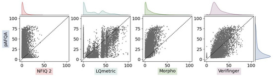 A scatter plot comparing the pAFQA with existing solutions. We compare visually a selection of quality assessment methods, computed on the testing subset of the NIST SD302 dataset. Each dot in the plot represents one fingermark image, where the y-position marks the pAFQA quality values, while the x-position marks the quality values of other quality metrics. Displayed also are the score distribution histograms of the five quality metrics being compared.