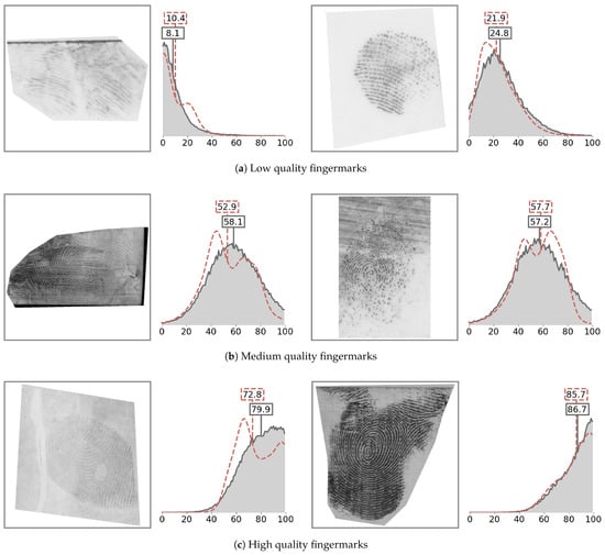 The first row (a) contains only fingermarks with a small impression area, various distortions, or ambiguous friction ridge structure. Consequently, the image pixels are mostly categorised into the lowest- and low-quality regions. We can see that that empty and noisy areas in the image were best correlated with the lowest-quality category. However, we can see that the model appeared to correctly localise the ridge structure in all three cases in the first row. The fingermarks in Row (b) mostly contain a mix of different quality regions. Within the fingermarks in Row (c), we can observe high contributions to the highest-quality range (80–100) for large areas of the impression. This also included the first-level features of the fingermark, i.e., cores and deltas, when these were present. The calculated quality maps may contain some artefacts (apparent salient regions, where there was no friction ridge pattern from that category present). Such artefacts normally occurred on the border of the friction ridge pattern where the image was masked or were a side-effect of resizing the CAMs to the dimensions of the original image. We believe the generated quality map should be observed together with the overall contribution map to obtain the best understanding of the final quality prediction.