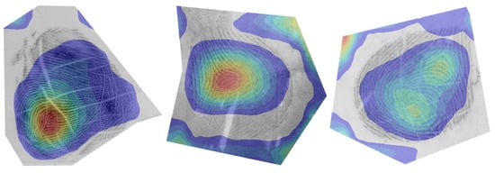 We first looked at the visualisations of high-quality fingermarks in Figure 6. The pAFQA model focused on the high-level features of the fingermark, specifically the cores and deltas [46]. These are locations where the orientation of the friction ridge pattern changes. When these features are present in a fingermark, the dactyloscopic experts will consider such traces as high(er)-quality. This is because, from the location of cores and deltas in a fingerprint image, we can determine the first-level detail—the general pattern of the fingerprint, which on its own already contains some evidential value [47]. If a fingermark can be correctly classified into one of the general patterns, this means that we can eliminate fingerprints with a different pattern and the number of possible matches is substantially reduced. Additionally, we also know the orientation, which helps with the matching process, since fingerprints in a reference database are normally oriented upwards from the phalanx in the bottom to the fingertip at the top. The presence of cores and deltas could, therefore, speed up the automated matching process.