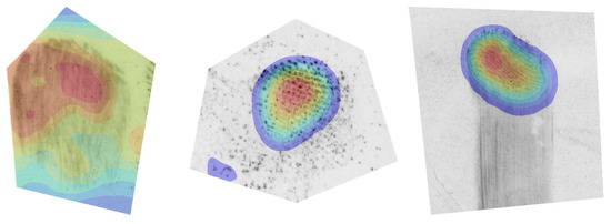 In Figure 6 and Figure 7, we observe the overall contribution map, generated using the outputs of the GradCAM algorithm. Such an image would supplement the final quality prediction and would allow an end user to better understand the prediction. Note that the activation maps were much smaller in size compared to the original image due to the hierarchical structure of the CNN. The CAMs were, therefore, resized back to the dimensions of the original input image. Due to this, the resulting maps were not very detailed and, therefore, only had the ability to weakly localise the contribution to the final prediction. The visualisation of CAMs was masked to match with the regions of interest of fingermark images.