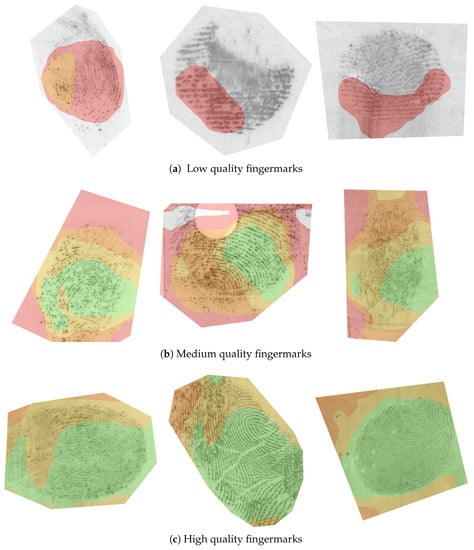 The intensity of individual CAMs is proportional to the contribution of the input pixels towards the respective quality value. We can, therefore, add CAMs from a particular quality range and construct a quality map that visualises the different quality regions of the fingermark. As already indicated in Figure 3, we attributed different colours to the different quality regions: the lowest-quality region (0–20) is coloured grey, low-quality (20–40) red, medium-quality (40–60) orange, high-quality (60–80) yellow, and highest-quality (80–100) green. The final results are presented in Figure 8.