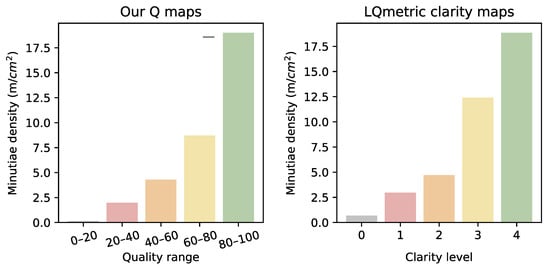 To confirm our hypothesis, we measured the minutiae frequency in the fingermarks, present in the SD302 dataset, and associated it with the five quality regions that made up our quality maps (grey, red, orange, yellow, and green). We first calculated the total area of each region produced on our test set. Given the known pixel density (PPI) of the images in the SD302 dataset, we transformed the area measurement from to cm2. Next, we counted minutiae points for each of the five regions independently. Finally, we calculated the minutiae density by dividing the total number of minutiae by the total area for a particular region. We repeated this procedure for the LQmetric clarity maps. The results are shown in Figure 9. We observed that both our quality maps, as well as the LQmetric clarity maps were highly correlated with the minutiae density. In comparison, the quality maps produced by our model appeared to be more consistent; each successive quality region contained roughly twice the number of minutiae of the previous level. The first quality level contained almost no minutiae points and was therefore a good background indicator. For the highest level in both our quality maps and LQmetric clarity maps, the minutiae density was calculated at 19.0 min/mm2 and 18.9 min/mm2, respectively. The average minutiae density ranges from around 19 to 24 mm2 in fingerprints [52]. The results in Figure 9 were consistent with these statistics. Given that even the best fingermark impressions contain some imperfections, we expected the minutiae density in the highest-quality areas in the fingermarks to be slightly lower than that of the fingerprints.