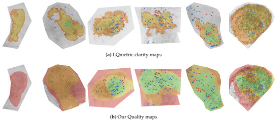 In Figure 10, we show the quality maps in relation to the minutiae points and compare these with the clarity maps produced by the LQmetric. The difference in the density of the minutiae for a specific quality region became apparent once the minutiae were superimposed. The green regions captured well the areas with a high minutiae density, in particular near singular points (cores and deltas). The density then dropped with lower-quality regions. In comparison, the LQmetric clarity maps were more detailed and fit better to the area of the friction ridge pattern, which made it a better tool for determining the region of interest. However, the relation between the LQmetric clarity maps and the minutiae point density was not as apparent visually. We can conclude that the quality maps generated by the pAFQA model were able to roughly localise and identify regions with different levels of minutiae density.