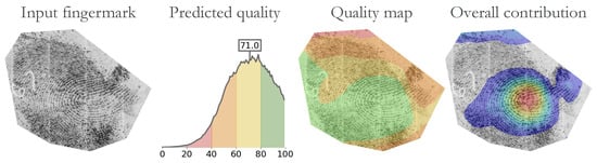 Example of the results, as presented to the end user. The pAFQA method not only predicted fingermark quality, but also generated intermediate representations, such as a quality distribution, a quality map, and the overall contribution of pixels to the final prediction. For the best understanding of model prediction, the results should be viewed together. The figure is best viewed in colour.