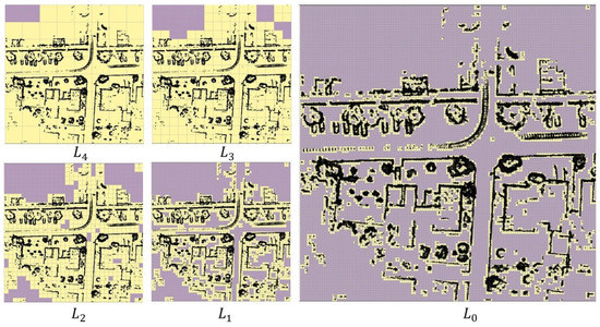The multi-resolution levels for the map are pre-computed offline and directly used during the S2M block computations. For example, Figure 3b shows the BEV map, of sequence ‘05’ of the KITTI odometry dataset, with horizontal planes removed. The KITTI dataset also contains true ground pose data that are used to assemble all the individual LIDAR scans and form the map . The corresponding map is constructed by neglecting the z-coordinate. A few instances of the corresponding multi-resolution grids are shown in Figure 4 for levels –. In this figure, the black points indicate the LIDAR scan points of the map, and the lighter yellow regions represent the grid cells that have at least one map point. The level with the highest resolution, (not shown in figure), was constructed with the desired matching resolution of . The subsequent levels were constructed by the max pool operation, as described in Section 3. Figure 5 also shows the zoomed-in image of the resolution grid. It can be seen that by removing the horizontal surfaces (roads and roofs of buildings), the LIDAR features for matching become prominent.