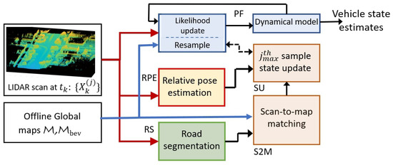 The overall approach is illustrated in Figure 2 for a single time step, where each block is used to designate a specific process or operation, and the arrows connecting them show the flow of information. The LIDAR scan at the current time step (shown on the left of Figure 2) is processed to result in the estimated vehicle pose shown on the right of Figure 2. The intermediate processing to estimate the vehicle pose is accomplished by various subsystems shown as blocks. These blocks (or processes) are labeled as particle filter block (PF), relative pose estimation block (RPE), road segmentation block (RS), scan-to-map matching block (S2M) and the sample update block (SU). The blocks are implemented in separate threads and run asynchronously. Specifically, the PF block running independently on a thread involves the computation of likelihood probabilities for the samples using the maps stored offline (shown on the left of Figure 2). The PF block is the primary block resulting in the vehicle state estimates. The convergence and robustness of the PF block are enhanced by the SU and S2M blocks, which enrich the samples/particles with high weights. Thereby, subsequent resampling will lead to better samples for the vehicle state. The SU and S2M blocks run on the same thread, updating the sample as soon as the scan-to-map matching is complete in the S2M block. The S2M block matches the LIDAR scan, where the road is segmented and removed by the RS block, to the offline map. The RPE block is run on a separate thread and computes the consecutive scan-to-scan poses and the corresponding linear and angular velocities. Finally, the RS block works in a background thread to generate LIDAR scans with the road removed. It is necessary to remove the road (and even flat surfaces) on the bird’s eye view of the map and the LIDAR scan as they do not contain features for alignment. The primary features in the top view of the map are often the building, wall and sidewalk edges that strongly aid the scan-to-map matching algorithm in Section 3. Though the S2M block is computationally intensive, it generates very accurate global pose alignment that outweighs its inherent complexity. The accurate global pose alignment significantly enhances the PF, making it accurate and even robust. The details of each block are further described below.