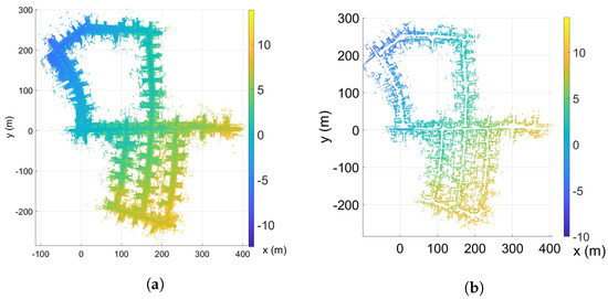 The scan-to-map matching procedure discussed in Section 3 is developed for scans. While developing a full scan-to-map matching procedure along similar lines is straightforward, the computational complexity renders the approach intractable. To this end, the LIDAR scans are matched to the global map in only . The success of the multi-resolution scan matching method is highly dependent on distinguishable spatial features in the map and the LIDAR scans. From the top view of the point cloud (by neglecting the z-coordinate), the lowest resolution grid will have points in almost every cell. The matching score over road regions will be smaller than the score for grid cells belonging to vertical walls or buildings. The LIDAR points corresponding to any temporary objects, such as a moving or parked vehicle, in the map could lead to degraded scan-to-map matching results. In the top view, the removal of flat horizontal surfaces (such as vehicle roofs) will reduce the affect of the remaining vertical surfaces of these temporary vehicles. As the scan-to-map matching cost in is aggregated over other stationary objects, such as buildings that have prominent features, such as vertical walls, corners and turns; therefore, the matching score becomes less sensitive to moving objects. Hence, to reduce the number of false positives, it would be advantageous to remove flat regions and improve the features in the top view that are dominated by vertical features, which are strongly captured by most LIDAR sensors. This is evident in Figure 3. To this end, the road segmentation block (RS) removes the roads that contribute to the major flat regions. Once removed, the top view will clearly show the turns and building borders as strong features for matching. Road segmentation methods are well studied and essential for road and lane detection. The approach of conditional random fields [28,29] provides effective means for road segmentation. Recently, deep learning models [30,31] provides alternative ways to segment road regions and, subsequently, remove them from the map and the scan. In this work, we simply choose to use surface normals to remove points belonging to flat regions. In particular, points with a z-coordinate of its unit normal vector greater than 0.75 are removed. This approach may not be appropriate for all environments, especially if the roads and surfaces are sloped, but it is computationally efficient and sufficient for enhancing walls and buildings, as shown in Figure 3 in our simulations. Ideally, a road segmentation algorithm, as mentioned above, should be used to improve the robustness of the entire localization approach. The color map in this figure corresponds to the height (z-coordinate), which varies by about 20 m. The dynamical model in Equations (8)–(12) is a model that also accounts for the z-coordinate of the vehicle.