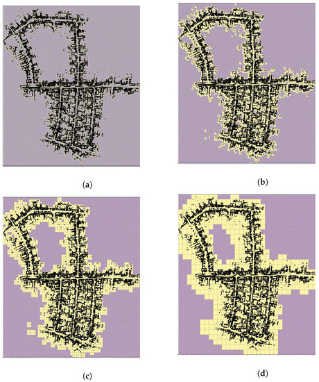 The pose of particle is used to transform the LIDAR scan points from the sensor reference frame to the world inertial frame and then their corresponding distance to their closest neighbors in the map are determined. The likelihood is simply constructed as a measure of how close the transformed LIDAR scan is to the map. This likelihood function is strongly influenced by the chosen parameters of maximum distance and standard deviation . is the distance between a point x and its closest neighbor in the map . The nearest distance can be efficiently computed by kdtrees and octrees. However, it is to be noted that a typical LIDAR scan contains more than 100 K points. When combined with a large number of particles ( 1000–10,000), the number of nearest neighbor searches () becomes computationally intractable. To this end, the authors of [2] propose to decimate the number of points in the LIDAR scan to achieve better real-time performance. In other words, the number of points in the LIDAR scan is reduced by taking every nth point from the set of points in the scan. Parameter n is chosen by the user to reduce the computational complexity. The benchmarking results in [2] show sufficient localization capability with a much smaller subset of points of the LIDAR scan but with a large number of particles. To this end, we use this benchmark as a guide and instead use voxel-based down-sampling to reduce the number of points uniformly over the space. In voxel-based down-sampling, only one sample is randomly chosen within each voxel. This allows the LIDAR scan to be uniformly distributed over the original LIDAR scan.