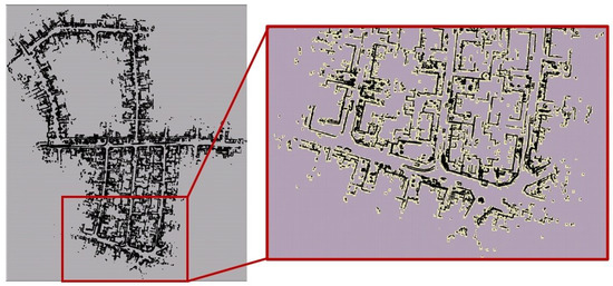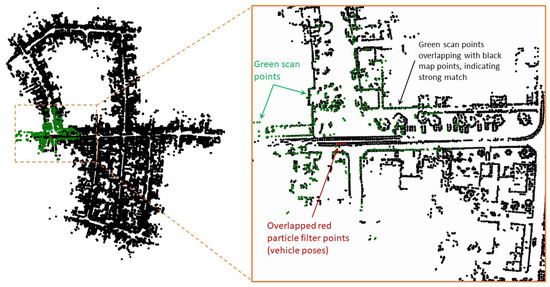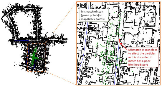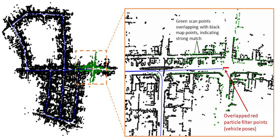 Figure 10 shows the snapshot at time step , where the S2M threads happen to return a result. The matched and propagated result to time step clearly failed, as seen in the zoomed-in section of Figure 10. The S2M matching process can occasionally fail in very dense regions or regions of the map that have similar-looking streets. This match is not accepted to update the pose of the particle, as the corresponding likelihood will significantly lower the weight of the particle compared to its original weight. This simple check can quickly disregard failed matches. Figure 11 shows the snapshot of the simulation toward the end of the map at time step . At this instant, the S2M block, which began at time step , resulted in a perfect match of the LIDAR scan and significantly improved the particle filter.