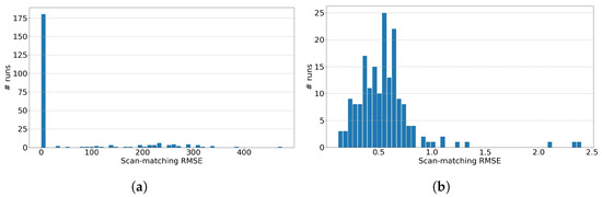 RMSE histogram for scan-to-map matching (x-axis units in meters). (a) RMSE histogram, (b) RMSE histogram for .