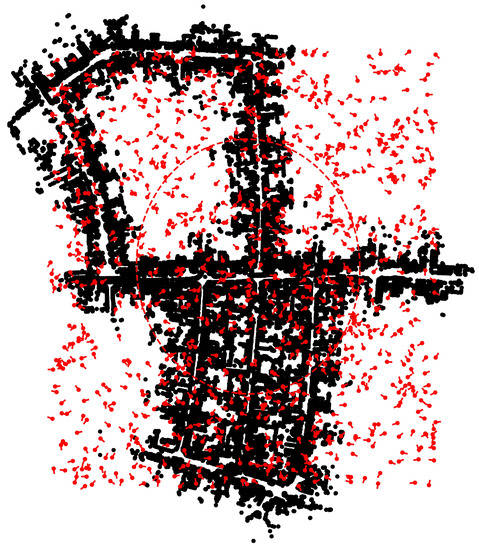 Figure 7 shows the initial time step where the particle filter is initialized over the whole map. The figure shows a top view or BEV of the map. While the positions of the particles are initialized in , only the projection is shown in Figure 7 as red circular markers (or dots) with a small line segment indicating the heading of the particle. As observed, all the particles have random headings and positions, and thus most particles have a very low likelihood. Only particles close enough to the true position of the particle will gain higher weights through higher relative likelihood values. However, with only 1000 particles, the probability of a particle falling close to the true position and also having a close enough heading (pitch and roll) to the true vehicle is very small. The only solution is to have a massive number of particles, especially in , to be close to the vehicle’s pose, which, in turn, makes the particle filter inefficient and even computationally intractable. The dotted red circle in the figure corresponds to the covariance ellipsoid of the position estimated by the particle filter.