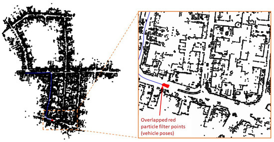 Figure 9 shows similar snapshots of the simulation at time step . The blue line is the ground truth trajectory of the vehicle. At this time step, there is no result from the S2M thread yet, in which case the conventional particle filter keeps track of the vehicle’s state. Figure 9 also shows a zoomed-in section, where all the particles are close together at the true position of the vehicle, thus providing reliable estimates between S2M thread computations. As such, the particle with the highest weight is often close to the vehicle’s state, thus leading to faster and more successful S2M thread results.