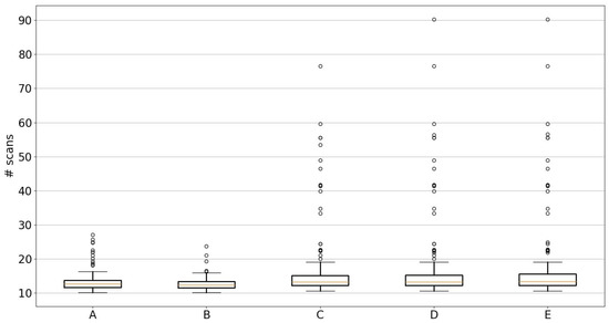 Figure 12 shows the results of the simulation on sequence ‘05’ of the KITTI odometry dataset. As the particles in the particle filter are randomly initialized, the simulations are repeated 250 times to generate statistical box plots of the localization performance. The localization performance is compared using five metrics (labeled as A, B, C, D and E in Figure 12), with units as the number of sequential LIDAR scans (y-axis in Figure 12) from time . Here, the number of time steps and the number of LIDAR scans are used interchangeably, as every time step of the simulation corresponds to a LIDAR scan. There are a total of 2750 LIDAR scans in sequence ‘05’ of the KITTI odometry dataset.