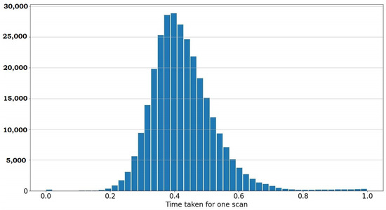 As described in Figure 2, the blocks run in parallel threads to provide fast particle filter estimates coupled with slower but accurate global pose estimates of the S2M block. In the simulations, an Intel i9 processor with eight cores was used to simulate the proposed approach with 32 GB of RAM. Point Cloud Library (PCL) -based implementation was used for the GICP in the RPE block and the second stage of the S2M block. The global nearest point to map distances is implemented using a parallel hash map [22] for fast retrieval. Alternatively, sparse tensors can be used to save and retrieve the distances. The simulation reads the scans from the KITTI database in a sequential loop and the wall-clock time is recorded between scans. This process is repeated over multiple runs using different initial conditions, and the recorded time between scans is shown using the histogram in Figure 13. As the threads run in parallel, the time also includes the time taken by the asynchronous S2M block. It can be observed that the average time to process a scan is 0.4 s, with a Gaussian-like distribution about the mean. It was observed that running the computationally intensive parallel routines on shared resources (CPU, RAM and caches) tends to make the overall process inefficient. It is to be noted that the objective of this paper is primarily to illustrate the validity of the proposed approach and not to establish high-performance implementation. Nevertheless, a distributed architecture using ROS2 [33] framework, where the computationally intensive scan-to-map matching routine is run on a separate machine, will significantly improve frame-per-second (FPS). Further, GPU implementation can significantly improve the scan-to-map matching block and the GICP computations.