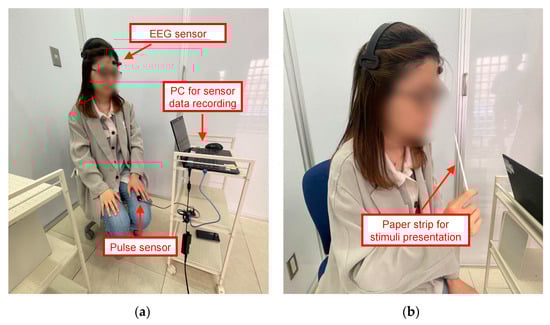 Experimental scene (a) when attaching sensors and (b) during stimulus presentation.