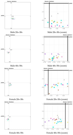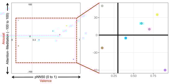 Figure 4 illustrates an example of an emotion map using Attention−Meditation as the arousal index and pNN50 as the valence index. The left plot illustrates the full-scale emotion maps. In this example, the arousal scales from −100 to 100 with 0 as a fixed origin point, and the valence scales from 0 to 1 with 0.3 as the origin point calculated from the average of resting condition of the participant data used in that emotion map. The right plot illustrates the zoomed version of the left emotion maps for a closer observation of the plots with a reduced scale. Similar emotion maps can be created in the same way by changing the arousal index to other EEG indexes (i.e., MA Hβ/Hα or δ wave) with different ranges. There is no change for pNN50 as the valence index for the creation of any emotion map.