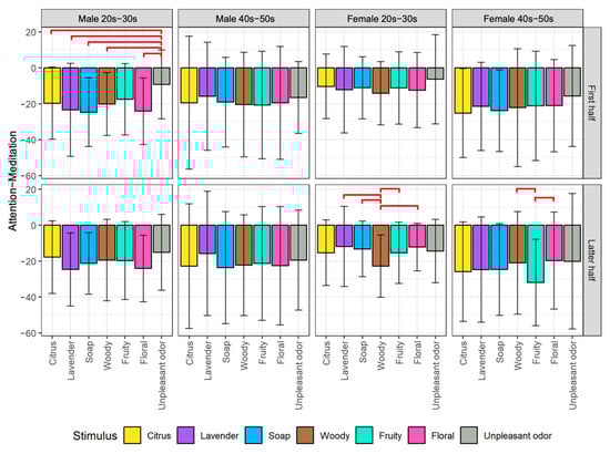 Comparison of changes in Attention−Meditation among stimuli by gender and generation groups divided into the first half (top) and latter half (bottom) of stimulus exposure time. The red lines indicate significant differences between pairs of stimuli.