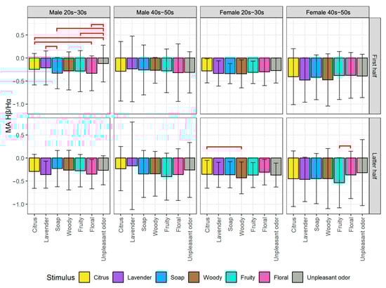 For the results of MA Hβ/Hα as shown in Figure 6, all participant groups tend to be more relaxed when being exposed to all olfactory stimuli, as indicated by the changes of MA Hβ/Hα toward the negative values. From the first half of the stimulus exposure time, there are significant differences in MA Hβ/Hα values for the male 20s–30s group when comparing unpleasant odor to citrus (p < 0.05), soap (p < 0.05), fruity (p < 0.05), and floral (p < 0.001), as well as when comparing citrus vs. floral (p < 0.05) and lavender vs. soap (p < 0.05). This result indicates that the unpleasant odor had a higher arousal effect than aromas on males in the younger generation group, which resembles the result of Attention−Meditation. In addition, the result reveals additional findings between the aromas suggesting a higher effect on relaxation for soap over lavender and floral over citrus, which provide a hint for the suitable aromas to evoke relaxation for younger males.