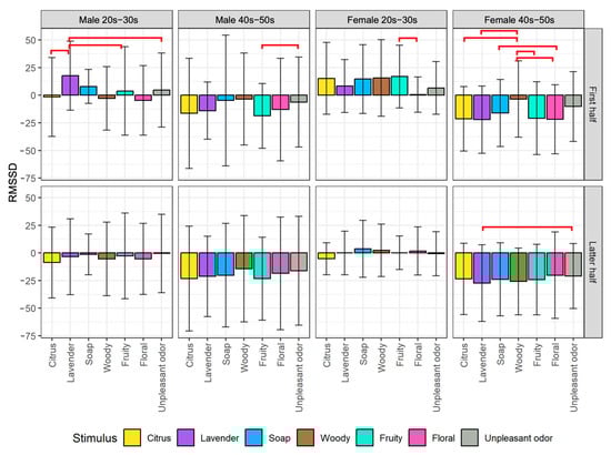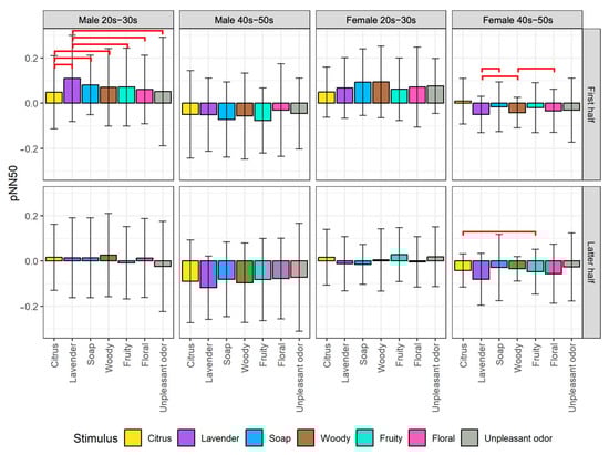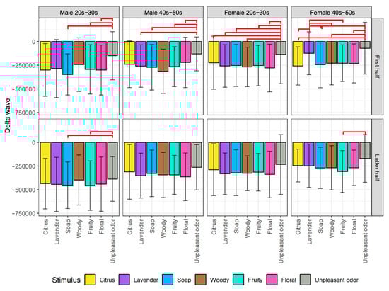 We plotted the average changes of biological indexes among the seven olfactory stimuli divided into the first half and latter half of the stimulus exposure time for each of the four participant groups. From the post hoc pairwise comparison, we obtained significant differences between some pairs of stimuli, as indicated by the red horizontal line on the figures. The detailed analysis results of the EEG and HRV indexes are described next.