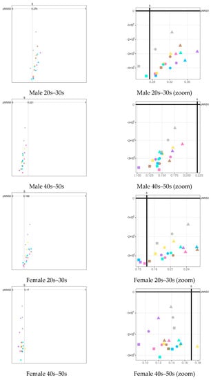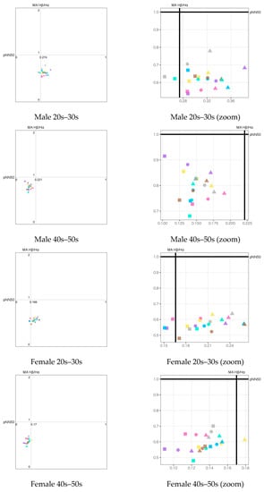 We conducted the statistical analysis of the data according to the grouping described in Section 4.3. Four groups of participants were divided by gender and generation. The biological indexes were calculated by dividing them into the first and latter half of the stimulus exposure time. Only the changes (normalized data) were used in the analysis. The statistical analysis method employed was a repeated measure ANOVA, with a post hoc pairwise comparison with no adjustment of p-values. The repeated measures ANOVA is used when the same group of participants is measured on two or more occasions, which allows us to analyze the changes within the same group over time while reducing the effects of individual differences and increasing the power of the analysis since the same participants are being compared [59]. In this case, the same group of participants was measured on seven occasions (i.e., seven olfactory stimuli) as a factor.