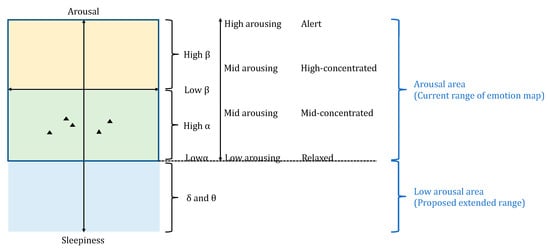 Based on the above findings of the emotion map, we propose a new range of arousal level (Y-axis), taking into account the low arousal area by using low EEG frequency bands, such as θ and δ waves, to ensure a relaxed state of the brain is included in the interpretation of psychological states as shown in Figure 14. A detailed analysis of this proposed emotion map will be performed in our future study.