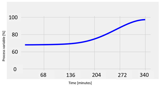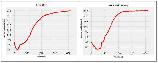 We can conclude that the developed software application satisfies the experimental requirements because there are no differences between the duration of the process determined using the proposed software (Figure 5) and the duration determined using the spectrophotometric method that was mathematically processed (Figure 6b).