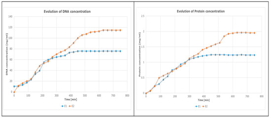 The control group (E2) is slower at reaching a stationary value (Figure 16: DNA ≈ 118 ng/mL; protein ≈ 1.9 mg/mL) compared with the vibrating group (E1) (Figure 16: DNA ≈ 79 ng/mL; protein ≈ 1.3 mg/mL); however, the plateau value of E2 is much higher than that of E1.