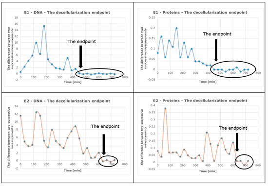 The decellularization process endpoint for each experiment was determined using a mathematical algorithm that calculates the differences between two consecutive measurements.