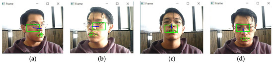 The size of the green boundary box that appeared around the user’s face was also changed. In the first version, it was 65 × 35 pixels (Figure 7a). However, the user sometimes had to make uncomfortable neck movements to generate cursor movements; thus, it was changed to a smaller size of 35 × 20 pixels (Figure 7b). This area was used to define the boundaries that helped to generate cursor movements.