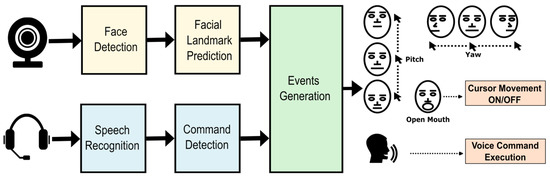 Figure 2 summarises how the interface works. First, in the face recognition module, video signals are captured and then a face detector and a face landmark predictor algorithm are applied. The emulator detects the user’s open mouth to generate an on/off control for cursor movement. Pitch and yaw head movements allow the user to move the cursor up, down, right and left. Second, in parallel with the face recognition module, voice signals are processed for speech-to-text conversion, which is compared with a list of commands. If there is a match between what the user has said and the list of commands, the appropriate action is performed.
