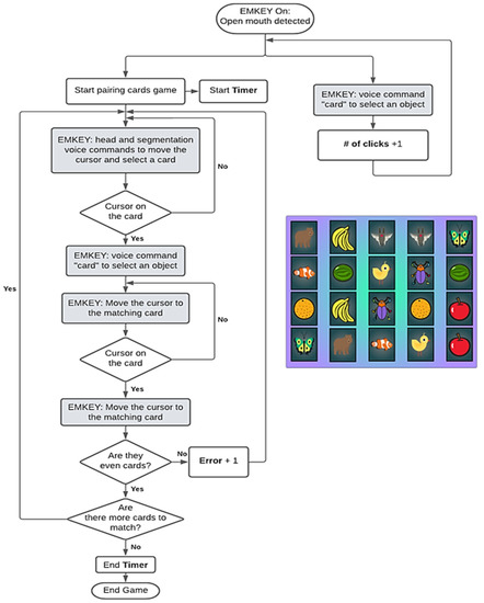 The EMKEY speech-to-text feature allows the user to emulate some mouse and keyboard functions. The only change in this aspect was the addition of some new commands, such as ‘select’ and ‘card’, for the pairing cards experiment.