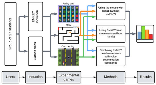 The first step in testing EMKEY through the experimental games was an induction given to the study participants about the use of the EMKEY emulator and the aims of each game. The participants were informed about the main features of the voice commands and the correct way to generate cursor movement with nose tracking. A printed sheet of the PC screen segmentation was given to each user to help them to identify the most useful area to move to when needed. Each user played all three games under the different conditions listed in Table 2. A person experienced in the use of EMKEY and the operation of the games was responsible for conducting these evaluations and answering questions from users during the tests. A process diagram presented in Figure 6 represents the process that participants underwent for this study.