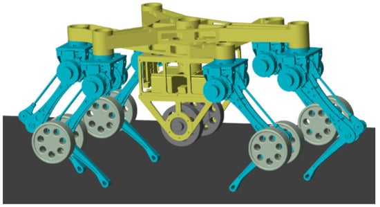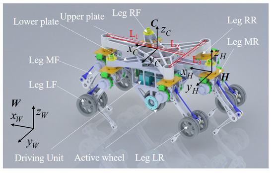 The TeCVP is designed for an improved model of an existing wheel-legged robot [32] equipped with five wheels and six legs. The main components and key coordinate systems of the wheel-legged robot are shown in Figure 1. The torso is composed of two triangular plates that are the same. The legs are located at the vertices of two plates and named according to the position of the legs, including left front leg (LF), middle front leg (MF), right front leg (RF), left rear leg (LR), middle rear leg (MR) and right rear leg (RR). The distance between the center of a plate and the front vertex L1 is 460 mm. The distance between the center of a plate and the line of two rear vertices L2 is 250 mm. The distance between the two rear vertices L3 is 490 mm. Each leg has two degrees-of-freedom (DOFs). The drive unit of each leg is located at the hip, while the knee joint is driven by a parallelogram structure.