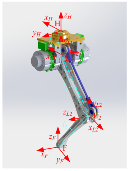 Moreover, the structure of a single leg is shown in Figure 2. The leg coordinate system H is at the top of the single leg while the coordinate system L1 is at the hip of the single leg. The axis zL1 is along the axis of the first joint of the single leg, and the axis yL1 is vertically upward. On that basis, the axis xL1 is determined via the right-hand-side rule. The coordinate system L2 is at the knee of the single leg and the axis zL2 is along the axis of the second joint of the single leg. The axis yL2 and the axis xL2 are shown in Figure 2. The coordinate system F is at the foot end of the single leg. The axis zF is vertically upward along the normal of the ground. The axis xF and the axis yF are shown in Figure 2. Distances between the coordinate system H and the coordinate system L1, the coordinate system L1 and the coordinate system L2, the coordinate system L2 and the coordinate system F are l0 = 120 mm, l1 = 310 mm and l2 = 290 mm, respectively, which is shown in Figure 2.