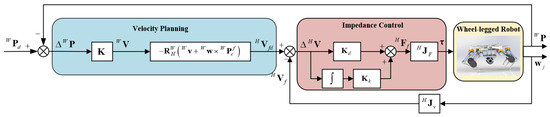 In addition, the mobile robot trajectory tracking control problem and the gait planning and control problem are well studied, such as the velocity vector control method [28] and the limited integrator anti-windup approach [29]. However, both problems need to be solved with one control method for wheel-legged robots to simplify the control framework. What is more, legged systems should realize soft interactions with an environment to ensure robustness against disturbances and protect hardware from damage through unexpected collisions. To address this issue, impedance control [30] is used to realize stable interactions with the environment in many studies. Over the years, impedance control has attracted great interest and some new control methods based on impedance control have been developed, such as nested impedance control [31]. Nested impedance control can be realized by combining impedance control and other control loops to gain better control performance and fulfill demands of different robots.