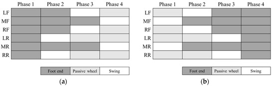 At the beginning of the leg-to-wheel switching process, the hexapod wheel-legged robot is in six-leg support. In order to reduce the change in the roll angle of the torso, the leg-to-wheel switching process should try to ensure legs that are axisymmetric about the axis xC of torso coordinate system C are in the same state. Figure 7a shows the leg sequence of the leg-to-wheel switching process. In Phase 1 of Figure 7a, all legs touch the ground. In Phase 2 of Figure 7a, legs LR and RR are raised and switched to the wheel support state, while the remaining four legs support the torso in its descent so that the active wheel touches the ground. In Phase 3 of Figure 7a, legs LF and RF are lifted up and make passive wheels touch the ground. Finally, legs MR and MF are lifted up and all passive wheels touch ground in Phase 4 of Figure 7a.
