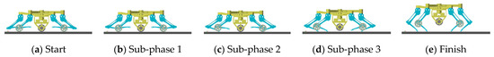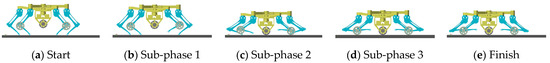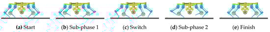 According to Section 3, the process of leg-to-wheel switching is shown in Figure 11. In the simulation, the robot is in hexapod support at the beginning (phase (a)), and all wheels are suspended. During phase (b), the two rear legs located at the right side of torso in the simulation are raised, and the four remaining legs make the torso descend until the active wheel touches the ground. Meanwhile, the angles of the hip joints and knee joints of legs LR and RR are adjusted until the passive wheels touch the ground and foot ends are retracted to a safe position. In phase (c), the two front legs LF and RF on the left side of the torso are raised and conduct the same motion as the legs LR and RR in phase (b). During phase (d), the legs at both ends are raised, and the foot ends are retracted to a safe position at the same time in phase (e). According to the leg sequence planning in Section 3, the simulation of the wheel-to-leg switching process is shown in Figure 12. In the simulation, legs at both ends are first converted to the leg support state. Then, legs LF and RF and legs LR and RR are converted to leg support state successively. Finally, the torso is raised to the initial height during legged motion. The entire wheel-to-leg switching process can be regarded as the inverse process of the leg-to-wheel switching process. Through simulation, it can be found that the wheel-to-leg motion presented in Section 3 can effectively complete the conversion from wheeled configuration to legged configuration stably.