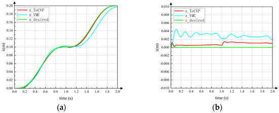 Displacement of torso in tripod gait. The same desired trajectory as the green line in the figures is tracked using the TeCVP and VMC. The blue line is the actual trajectory using VMC, while the red line is the actual trajectory using VMC. (a) Displacement x. (b) Displacement z.