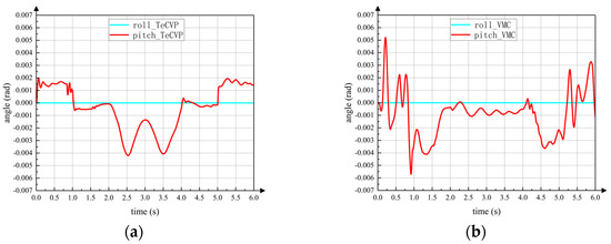 In addition, from the screenshots of simulation it can be seen that the posture change of the torso is relatively small during the switching process. Figure 13a,b show the posture of the torso during the switching process using TeCVP and VMC, respectively. In 0–3 s, the wheel-legged robot executes the transformation from the legged configuration into the wheeled configuration, while the transformation from the wheeled configuration into the legged configuration is executed in 3–6 s. At 0 s and 3 s, the states of the robot are as shown in Figure 11a,e. In 0–1 s, 1–2 s, and 2–3 s, the states of robot are as shown in Figure 11b–d, respectively. Similarly, at 6 s the state of the robot is as shown in Figure 12e. In 3–4 s, 4–5 s and 5–6 s, the states of the robot are as shown in Figure 12b–d, respectively. Using TeCVP, the pitch angle of the torso is relatively small and stable, as shown in Figure 13a. However, the pitch angle of the torso using VMC is much bigger than that using TeCVP. Hence, TeCVP can complete a more stable transformation between the wheeled configuration and the legged configuration.