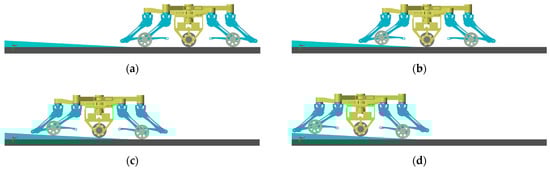 When the robot is in wheeled motion, it is necessary to keep the active wheel in contact with the ground to provide sufficient driving torque. Therefore, a simulation and an analysis of the transition from a flat terrain to a gentle slope in wheeled motion are conducted, as shown in Figure 14. In Figure 14a, the robot runs completely on flat ground, while Figure 14b–d complete the transition from flat terrain to slope for front wheels, active wheel and rear wheels. It can be seen that the active wheel is always in contact with the ground. In addition, the posture of the torso is kept relatively stable. Hence, the robot can adapt to the undulation of the ground.