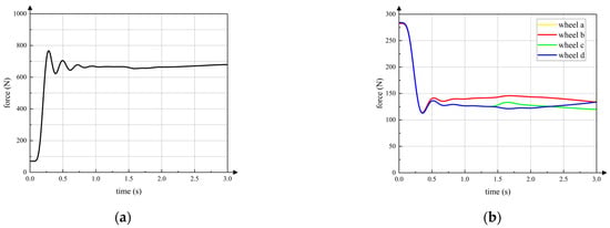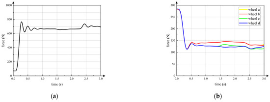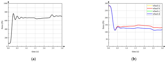 The curve in Figure 15a is the vertical component of the contact force between the active wheel and ground. The horizontal axis is the simulation time. The front wheels, the active wheel and the rear wheels start moving on the slope at 1.4 s, 2.3 s and 2.8 s, respectively, which is same in the following simulations. It can be seen that contact force between the active wheel and the ground remains relatively stable during the entire wheeled motion. The contact force feedforward and posture feedback adjustment strategies can ensure that the active wheel touches ground when the robot passes over the gentle slope. Curves in Figure 15b are vertical contact forces between passive wheels and the ground. Because the front passive wheel a and passive wheel b are symmetrical with respect to the axis xC of torso coordinate system C, the contact forces of passive wheel a and passive wheel b are almost same. Thus, contact force curves of passive wheel a and passive wheel b seem like one curve. In addition, the rear passive wheel c and passive wheel d have same characteristics of passive wheel a and passive wheel b. The contact forces of passive wheels are always within a certain range to keep the active wheel touching the ground.
