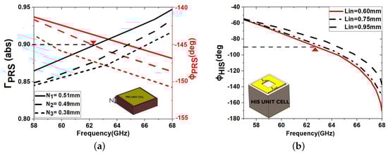 (a) Magnitude and phase reflection coefficient of the PRS unit cell. (b) Phase reflection coefficient of the HIS unit cell with respect to with = 1.50 mm.