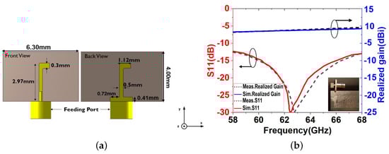 In this section, a printed dipole antenna (PDA) is designed, which will serve as a primary feeding for the complete leaky wave antenna structure. A design model of this feeding dipole antenna can be seen in Figure 4a. Its dimensions are optimised for best performance in the 60 GHz frequency range. The printed dipole antenna (PDA) is etched on RT/Duroid 5880 with a dielectric constant of = 2.2 and a thickness of 0.13 mm. A reflector is placed on the backside of the printed dipole antenna (PDA) at an optimised distance of 0.41 mm to improve the functionality of the LWA in the plane [24]. Figure 4b shows that the simulation and measured results of and realised gain are in good agreement.