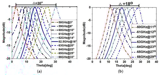 The phase reflection coefficients of PRS and HIS as a function of frequencies are used to demonstrate LWA beam scanning. These coefficients are derived using Equation (1), which produces a wide scanning angle of , as shown in Figure 6a. It was found that when HIS is replaced by a ground plane, the beam scanning reduces drastically to with few frequencies, as shown in Figure 6b. This is because the ground plane is not sensitive enough to produce high phase reflection coefficients compared to HIS arrays. The cavity height and maximum gain calculation can be found in [20]. The far-field radiation patterns (FRPs) of the proposed antenna design are shown in Figure 7a for a cavity height of mm. In particular, Figure 7a depicts the 2-D FRP in the E-plane at various frequencies within the operational range, and Figure 7b depicts the 3-D FRP at 62.5 GHz.