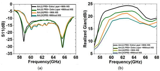 The parameters for the gain comparison for these four cases are depicted in Figure 8. The (Figure 8a) is well below −10 dB for all four LWA models for cavity heights = 2.90 mm (antenna with HIS) and = 3.32 mm (antenna without HIS), and the realised gain remains above 19 dBi for the frequency range of 58 to 67 GHz. It is furthermore evident from Figure 8 that the proposed multi-layer LWA impedance matching, gain, and bandwidth are significantly improved (24.3 dBi and 8 dB) by adding an extra plain dielectric slab over the PRS array with a beam scanning range of about and a scanning loss of 3 dB. The proposed multi-layer LWA with HIS and dielectric exhibits a narrower half-power beamwidth (HPBW) compared to the other configurations, spanning from at 58 GHz to at 66.7 GHz. Additionally, the sidelobe level of the proposed multi-layer LWA remains below −10 dB in all the frequency bands. The antenna’s simulated results are closely related to their previously calculated expected results. The aforementioned results are summarised in Table 1.